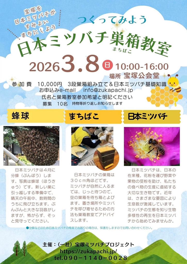 2026年2月26日 / 最終更新日時 : 2026年2月26日 miyakami お知らせ 日本ミツバチ巣箱教室開催のお知らせ 宝塚ミツバチプロジェクトでは、分峰の時期に合わせて巣箱作り教室をおこなっています。ミツバチのことを知りたいな、養蜂に携わってみたいな、と考えておられるみなさま。どうぞこの機会をお見逃しなく!